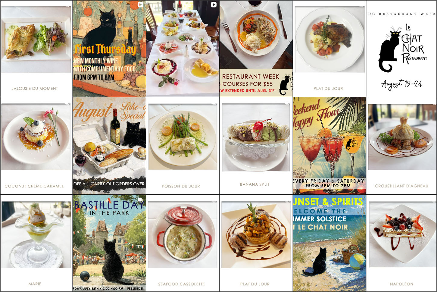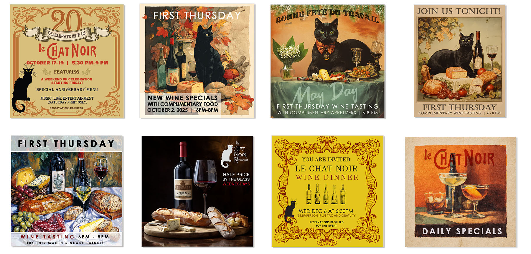Le Chat Noir regularly features special events, daily promotions, and seasonal menu items. Each social media post is designed with a balance of vintage and clean aesthetics to maintain visual consistency while reflecting the restaurant’s Art Nouveau–inspired brand. The goal is to create an engaging and cohesive look across the entire social media feed.