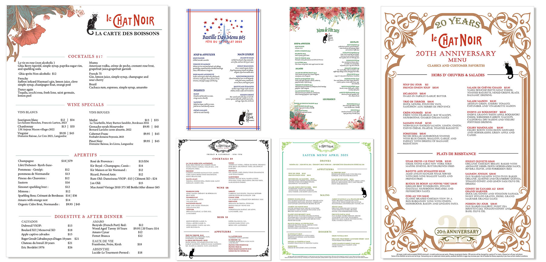 Le Chat Noir features seasonal menus that are updated throughout the year. While the design is occasionally refreshed, it consistently maintains the restaurant’s signature vintage aesthetic. Special holiday events receive unique menu designs that reflect the theme of each occasion. Typography is carefully selected to ensure clarity and readability, especially for Le Chat Noir’s many long-time patrons, including elderly guests, making it important that the fonts remain elegant yet easy to read.